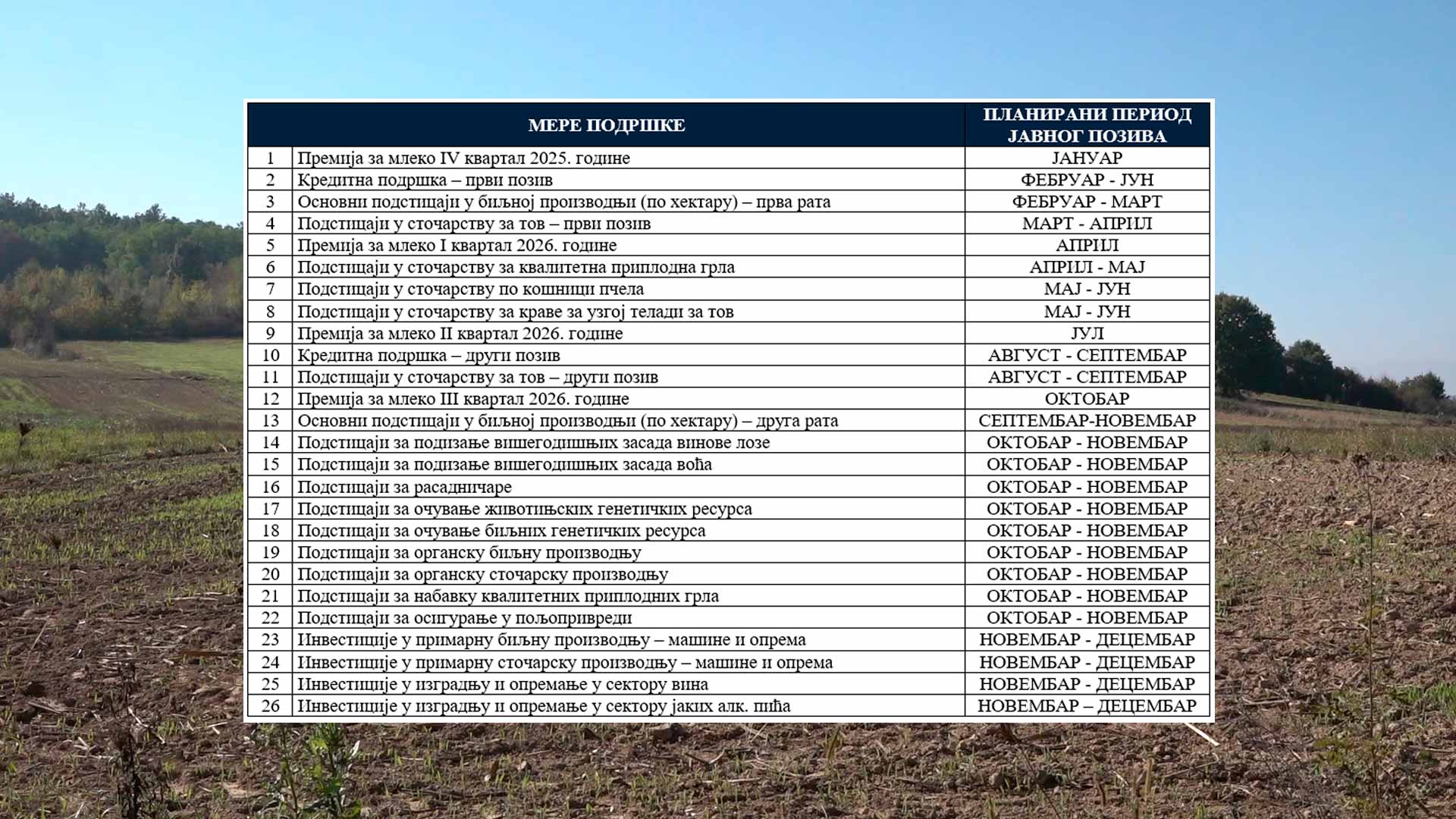 MINISTARSTVO POLJOPRIVREDE OBJAVILO KALENDAR PODSTICAJA ZA 2026. GODINU